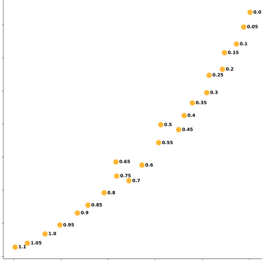Figure 2: t-SNE visualization s for the decoder selfattention constituent of the simplification model’s length compression control prefixes. Each circle represents a control prefix corresponding to each length ratio (bins of fixed width 0.05, from 0 to 1.1).