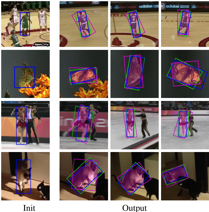 Figure 1. Our approach SiamMask E yields lager IoU between the ground truth (blue) and its prediction (green) than the original SiamMask (magenta). SiamMask E predicts a higher accuracy on the orientation of the bounding boxes which improves the average overlap accuracy (A) and expected average overlap (EAO).