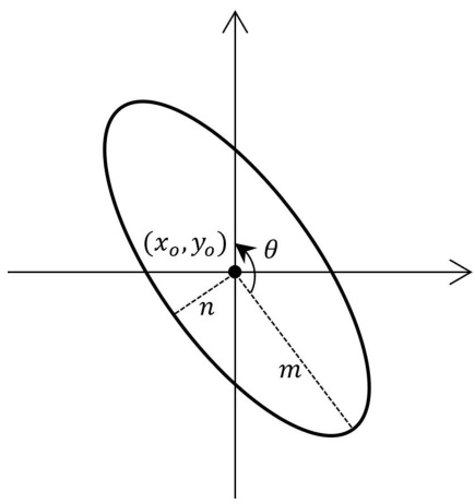 $m$ semi-major axis $n$ semi-minor axis $(x_{o},y_{o})$ center coordinate of the ellipse $\theta$ rotation angle