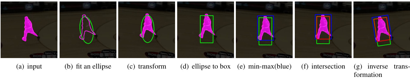 图 3: 我们的算法包含七个步骤:(a) 以目标掩码作为输入。(b) 在掩码边缘应用椭圆拟合算法 [8] (此处我们将边缘点集记为公式4中的集合 $A$),随后确定椭圆中心及旋转角度。(c) 利用椭圆旋转角度和中心计算仿射变换矩阵,并对椭圆中心应用该变换。(d) 在椭圆上应用旋转矩形边界框 (绿色)。(e) 在变换后的掩码上绘制最小-最大轴对齐边界框 (蓝色)。(f) 计算蓝色框与绿色框的交集以形成新边界框 (红色)。(g) 计算仿射变换矩阵的逆矩阵,应用逆变换转换回原始图像坐标系,最终输出红色框。