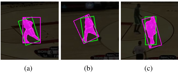 与生成轴对齐边界框的SiamFC、SA-Siam和SiamRPN不同,SiamMask [35] 利用了视频对象分割数据集的优势,训练了一个孪生网络来预测目标上的一组掩码和边界框。这些边界框是基于掩码通过旋转最小外接矩形 (MBR) 以87帧/秒的速度估算得出的。然而,MBR并不总能预测出与真实边界框完美对齐的边界框 (见图 1)。尽管采用VOT2016中用于生成真实值的相同边界框预测算法可以显著提高平均重叠精度,但运行速度会降至5帧/秒。为了解决这个问题,我们在第3节提出了一种新方法,能够实时处理帧并取得更好的结果。