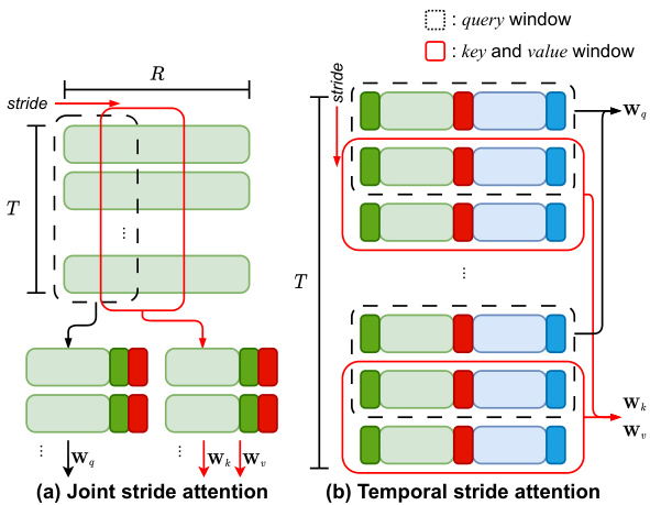 图 4: 提出的跨步注意力模块。(a) 联合跨步注意力,其中一系列联合token被分组为查询、键和值,包含所有时间维度的跨步窗口。(b) 时序跨步注意力,其中token与时序跨步窗口捆绑,以融合时间步长的变化。