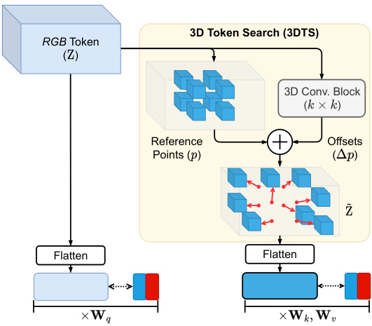 where $\mathrm{Z}\in\mathbb{R}^{4C\times T\times\frac{H}{8}\times\frac{W}{8}}$ and $\tilde{\boldsymbol{\mathrm{Z}}}\in\mathbb{R}^{4C\times\tilde{T}\times\tilde{H}\times\tilde{W}}$ are the input and selected $R G B$ tokens respectively. The size of $\tilde{T}$ , $\tilde{H}^{\cdot}$ and $\tilde{W}$ are determined based on the kernel size $k$ . In our case, we set the $k$ as 7 without padding for sparsely extracting deformable tokens and increasing the efficiency. In addition, $\mathbf{W}_{q}\in\mathbb{R}^{4C\times4C}$ and $\omega$ are trainable weight and model parameters for the MSA and 3D conv block in the 3DTS, respectively. It should be noted that while query tokens are composed in the same manner as the transformer, the key and value tokens are composed of selected tokens from the 3DTS. Further details on our implementation are in Appendix B.