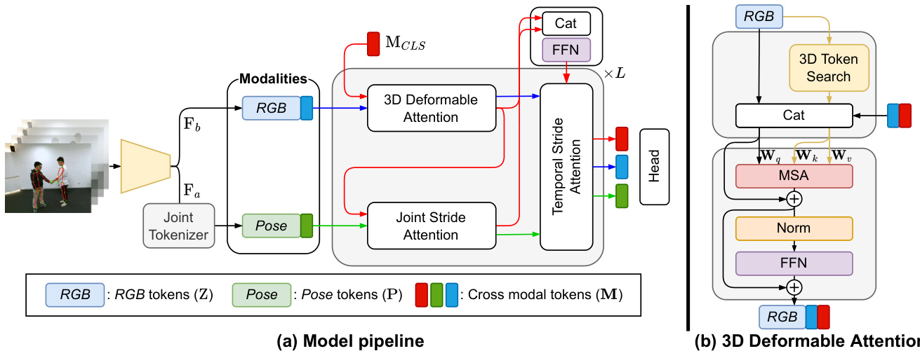 Cross-modal tokens. An intuitive method is to concatenate all tokens from both modalities, considering the charact eris tics of each token, and then combining information through the transformer stacks. However, to combine different modalities in a single transformer, a deliberate design is required, and the modalities must be cooperative and complementary. Similarly, in STAR [1], the authors employ multi-class tokens for cross-modal learning. Despite a simple yet effective approach, on par with other trans- formers, it is aimed only at an information fusion for all tokens without considering the intrinsic properties and comple ment ari ties of various modalities. Therefore, we propose a cross-modal token that effectively combines the different modalities within the transformer. The cross-modal token $\mathbf{M}\in\mathbb{R}^{4C\times T\times3}$ is a set of three trainable tokens: CLS, RGB and pose modal tokens. In previous studies [18, 41], CLS tokens were used as the final embeddings fusing information by interacting with other tokens. We consider the CLS token $\mathrm{M}{C L S}\in\bar{\mathbb{R}}^{4C\times T\times1}$ as a ‘modality-mixer’ compiling the remaining two modal tokens, which are dispatched to mutual modalities to trade their domain knowledge. The first $\mathrm{M}{R G B}$ and $\mathrm{M}{C L S}$ tokens are fed to the 3D deformable attention. Then, the output $R G B$ and $C L S$ modal tokens, $\mathrm{M}{R G B}$ and $\mathrm{M}_{C L S}$ of a 3D deformable attention, reflect information from their own domains through separated transformer blocks cooperating with the dispatched $C L S$ tokens. Hereafter, we introduce the 3D deformable attention shown in Fig. 2 (b), which is the core of the proposed transformer. 3D deformable attention. Although transformers have recently become a new standard in vision tasks, relatively few studies have been conducted on action recognition tasks. Because the nature of a transformer considers long-term relations between the input tokens, it may lead to an expone nti ally increasing computational complexity with the time steps. In addition, to solve the problem of static transformers, DAT [47] that flexibly selects the key and value positions in a self-attention has been proposed; however, it is unsuitable for an action recognition that has to deal with cross-modalities and s patio temporal features. To alleviate the complexity while maintaining the nature of the transformer, inspired by [47], we propose the use of 3D deformable attention for action recognition, as shown in Fig. 2 (b). 3D deformable attention can adaptively capture spatio temporal features on the $R G B$ modality.