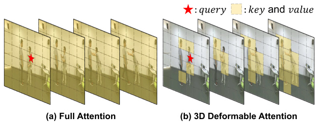• 我们提出了首个3D可变形注意力机制,如图1(b)所示,该机制能自适应地考虑Transformer中的时空相关性,突破了以往研究在完整序列中针对特定查询考虑所有Token的做法。