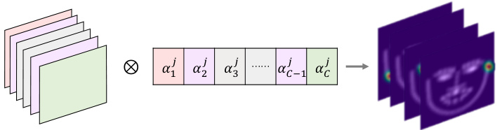 其中 $M$ 是地标(landmark)数量,$h_{i}$ 表示第 $i$ 个地标的热力图(heatmap),$\alpha_{m}^{i}$ 是可学习参数。实验中,该线性组合可通过 $1\times1$ 卷积核(Conv2D)层实现。此外,图 2: 提供了可视化说明。