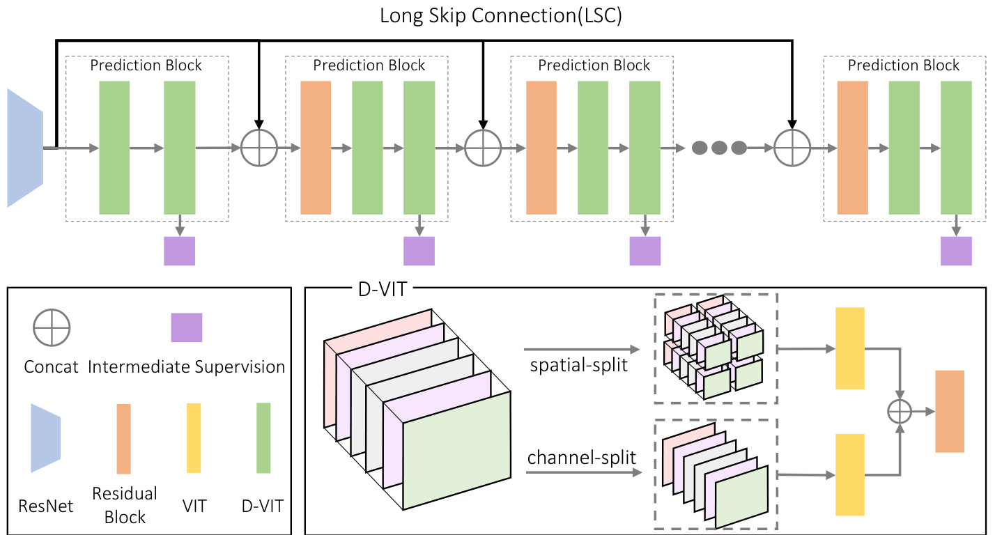 图 1: 本框架架构示意图。长跳跃连接(图中上方黑线)将底层特征分发至每个预测模块,从而防止有效信息被中间监督丢弃。D-ViT通过空间分块学习图像的上下文特征,并利用通道分割特征捕捉关键点间的几何关联。