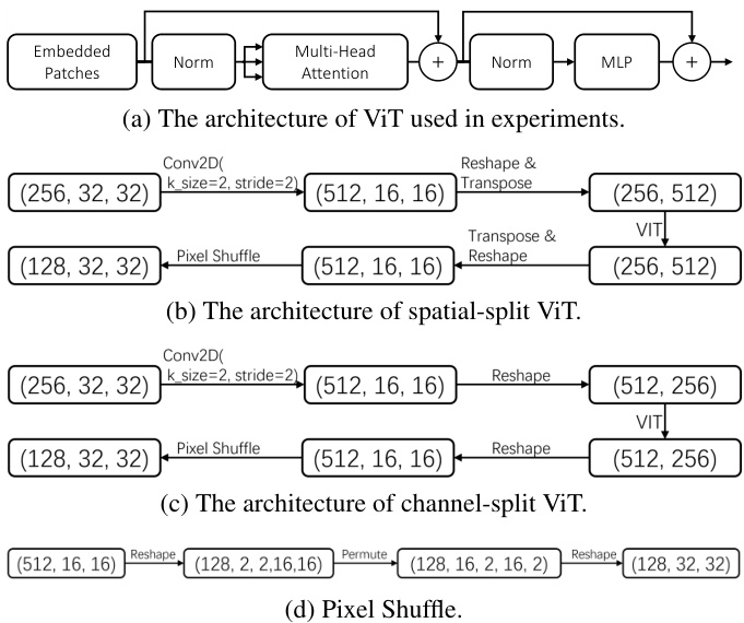 其中 $P a t$ 表示空间分割块 (spatial-split patches),Chn 代表通道分割特征 (channel-split features),$||$ 指沿通道维度的拼接操作,$C o n v(\cdot)$ 为残差卷积块。得益于这种设计,我们的 D-ViT 能够同时利用空间分割块和通道分割特征来提取图像特征并建立关键点间的内在关联,从而在三个基准测试中均取得了最先进的成果。在下文讨论中,我们将标准空间分割的 ViT 称为空间分割 ViT (spatial-split ViT),将通道分割的 ViT 称为通道分割 ViT (channel-split ViT)。