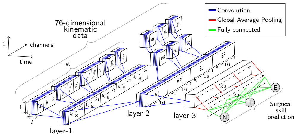 Our approach takes inspiration of the recent success of CNN for time series classification [17]. The proposed architecture (Figure 1) has been specifically designed to classify surgical skills using kinematic data. The input of the CNN is a MTS with variable length $\it l$ and 76 channels. The output layer contains the surgical skill level (N, I, E). Comparing to CNNs for image classification, where usually the network’s input has two dimensions (width and height) and 3 channels (RGB), our network’s input is a time series with one dimension (length $\textit{l}$ of the surgical task) and 76 channels (the kinematic variables $x,y,z,x^{\prime}$ , etc.).