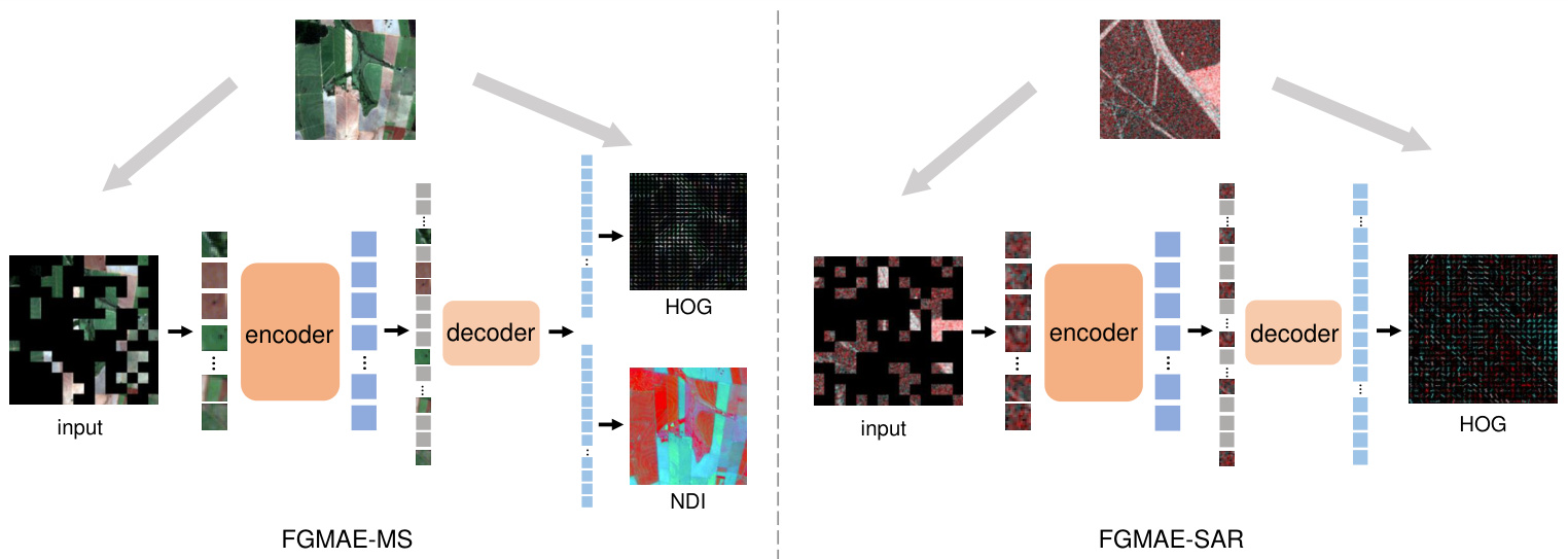 We then develop our proposed self-supervised methods, FGMAE, based on the feature study. We consider two popular modalities in RS, multi spectral imagery and polar i metric SAR imagery. For multi spectral imagery, we combine spatial feature HOG and spectral feature NDI to complement each other; for SAR, we select HOG for its computational efficiency and noise robustness.