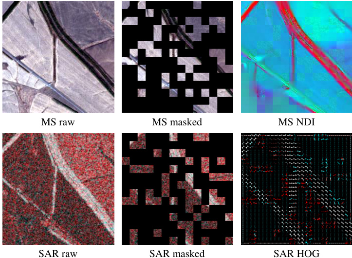 Fig. 1. Sample data of the proposed FG-MAE method—columns from left to right: Sentinel-2 multi spectral (MS) and Sentinel-1 (SAR) imagery, masked model inputs, model-reconstructed features (HOG: Histogram of Gradients, NDI: Normalized Difference Index). False color of the raw SAR image is coded by [VV, VH, $(\mathrm{VV+VH})/2]$ . False color of the reconstructed MS NDI is coded by [NDVI, NDWI, NDBI].