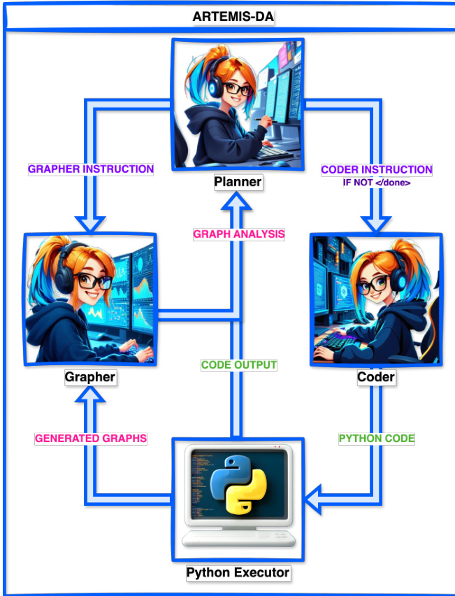 The Coder, in turn, translates the Planner’s instructions into executable Python code, dynamically generating and executing the necessary operations within a Python environment. Whether performing data transformations, training predictive models, or creating visualization s, the Coder bridges the gap between high-level task specifications and low-level computational execution. This dynamic interplay between the Planner and Coder components enables ARTEMIS-DA to handle analytical tasks autonomously, requiring minimal user intervention.