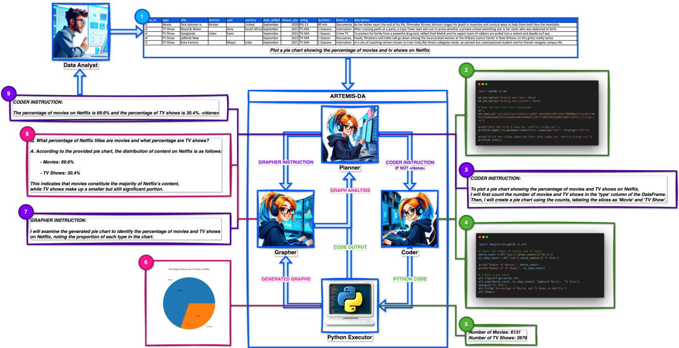 To address this gap, we propose the Advanced Reasoning and Transformation Engine for Multi-Step Insight Synthesis in Data Analytics (ARTEMIS-DA), a comprehensive framework explicitly designed to unlock the potential of LLMs for advanced multi-step data analytics tasks. ARTEMIS-DA introduces a tri-component architecture consisting of a Planner, a Coder, and a Grapher, each playing a crucial, complementary role. The Planner acts as the framework’s coordinator, interpreting complex user queries and decomposing them into a sequence of structured instructions tailored to the dataset and analytical goals. These instructions encompass tasks such as data pre-processing, transformation, predictive analysis, and visualization. By leveraging the natural language understanding and reasoning capabilities of LLMs, the Planner ensures clarity and structure in task execution, addressing the intricacies of multi-step analytical workflows.