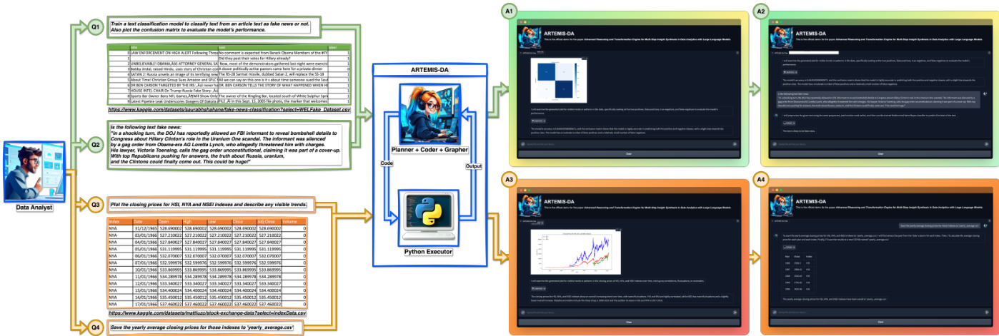 Figure 1: ARTEMIS-DA showcasing $\boldsymbol{\mathcal{Q}}\boldsymbol{I}$ . advanced reasoning for complex queries, $\boldsymbol{\mathcal{Q}}2$ . predictive modeling for text classification, $\boldsymbol{\mathcal{Q}3}$ . data visualization for insights, and $\pmb{Q4}$ . efficient data transformation for manipulating datasets.