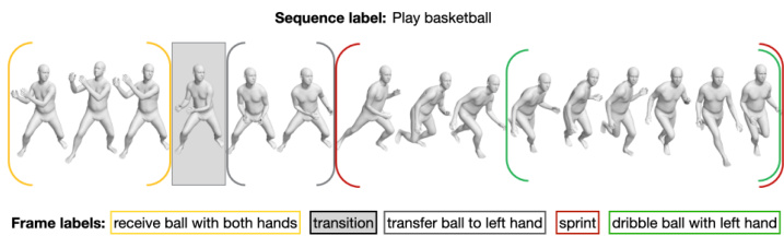 We acquire action labels for sequences in BABEL, at two different levels of resolution. Similar to existing mocap datasets, we collect a sequence label that describes the action being performed in the entire sequence, e.g., Play basketball in Fig. 1. At a finer-grained resolution, the frame labels describe the action being performed at each frame of the sequence, e.g., transfer ball to the left hand, sprint, etc. The frame labels are precisely aligned with the corresponding frames in the sequence that represent the action. BABEL also captures simultaneous actions, e.g., sprint and dribble ball with left hand. When collecting frame labels, we ensure that all frames in a sequence are labeled with at least one action, and all the actions in a frame are labeled. This results in dense action annotations for high-quality mocap data.