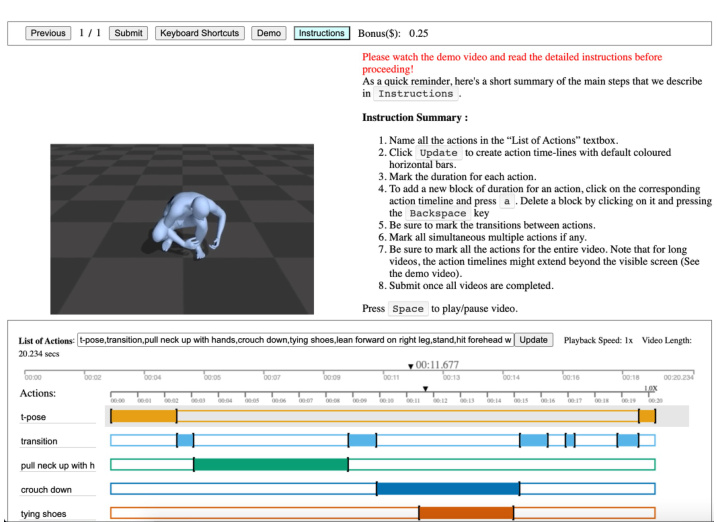 To provide frame labels, an annotator first watches the whole video and enters all the actions in the ‘List of Actions’ text-box below the video. This populates a set of empty colored box outlines corresponding to each action. The annotator then labels the span of an action by creating a segment (colored rectangular box) with a button press. The duration of the segment and the start/end times can be changed via simple click-and-drag operations. The video frame is continuously updated to the appropriate time-stamp corresponding to the end time of the current active segment. This provides the annotator real-time feedback regarding the exact starting point of the action. Once the segment is placed, its precision can be verified by a ‘play segment’ option that plays the video span corresponding to the current segment. In case of errors, the segment can be further adjusted. We provide detailed instructions via text, and a video tutorial that explains the task with examples, and demonstrates operation of the annotation interface. The web interface of the task is provided in the project website.