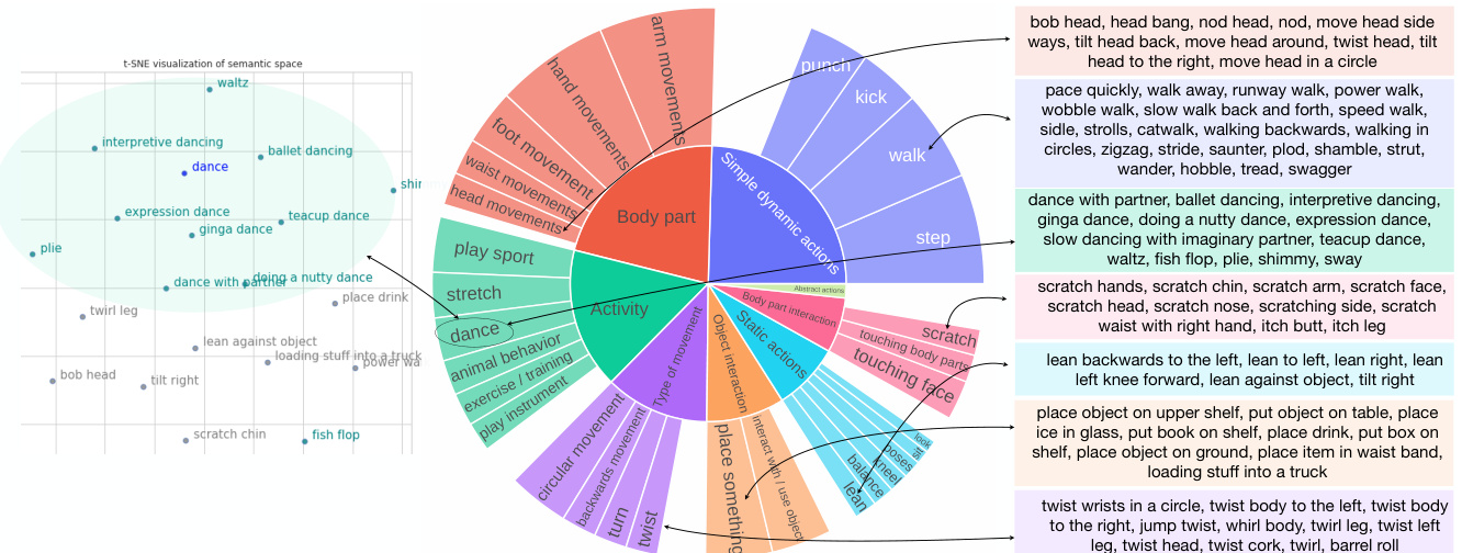 动作类别。我们通过半自动化流程将动作变体映射到单一类别,该流程包括对原始标签进行聚类,然后进行手动调整。