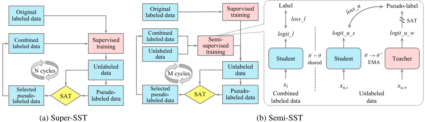 As illustrated in Figure 1b, Semi-SST enhances Super-SST’s offline pseudo-labeling pipeline by integrating an EMA-Teacher model [35], introducing dynamic online pseudo-labeling to complement the offline process. Specifically, in EMA-Teacher, the teacher model dynamically generates pseudo-labels online, while the student model is trained on both offline combined labeled data and these online pseudo-labeled data. Semi-SST thus employs both offline and online pseudo-labeling mechanisms, with SAT applied in both cases to ensure the selection of high-confidence pseudo-labels. Table 1 outlines the primary distinctions between Super-SST and Semi-SST.