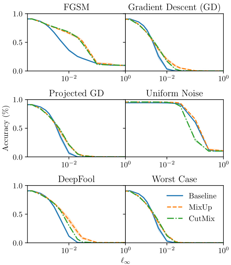 Having established that MixUp distorts learned functions, we now seek to answer the third question from our introduction by determining the impact of data distortion on trained class if i ers. Since it is our assessment that models trained with MixUp have an altered ‘perception’ of the data distribution, we suggest an analysis based on adversarial attacks, which involve perturbing images outside of the perceived data distribution to alter the given classification. We perform fast gradient sign method, standard gradient descent, projected gradient descent, additive uniform noise, and DeepFool [28] attacks over the whole CIFAR-10 test set on PreAct-ResNet18 models subject to $\ell_{\infty}$ constraints using the Foolbox library [33, 34]. The plots for the additive uniform noise and DeepFool attacks, given in Figure 1, show that MixUp provides an improvement over CutMix and the augmented baseline in this setting. This is because MixUp acts as a form of adversarial training [16], equipping the models with valid classifications for images of a similar nature to those generated by the additive noise and DeepFool attacks. In Figure 1, we additionally plot the worst case robustness following all attacks as suggested by Carlini et al. [18]. These results show that the adversarial training effect of MixUp is limited and does not correspond to a general increase in robustness. The key observation regarding these results is that there may be practical consequences to training with MixUp that are present but to a lesser degree when training with CutMix. There may be value to creating a new MSDA that goes even further than CutMix to minimise these practical consequences.