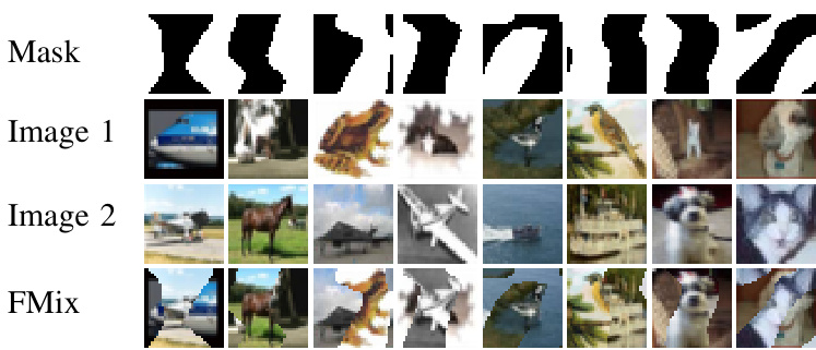 Fig. 2: Example masks and mixed images from CIFAR-10 for FMix with  $\delta=3$   and  $\lambda=0.5$  .