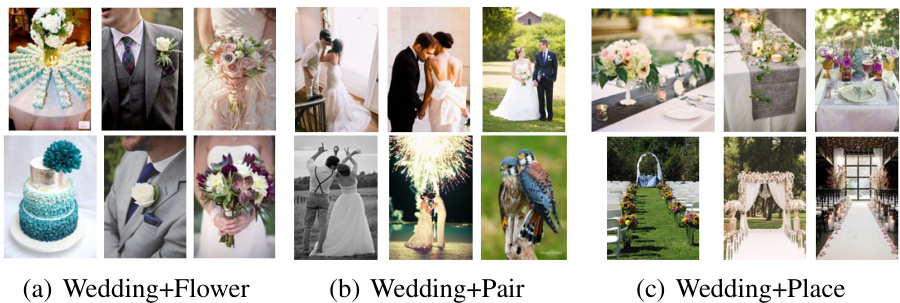 Considering that iterative clustering and discrimination are time-consuming, we only employ one step of off-line clustering in this work. Aided by the efficient feature quantization (Johnson et al., 2019), the large-scale LAION 400M dataset can be clustered within 10 minutes using the embedded image and text features. The only hyper-parameter we consider here is the cluster number $k$ . Even though the clustering step is straightforward, the automatically clustered large-scale dataset inevitably confronts inter-class conflict due to multi-label signals in one image and specific definition of class granularity (as illustrated in Fig. 3). For instance, the bird pair in Fig. 3(b) is clustered into wedding pair, which will be conflicted with another specific category of bird. In addition, the close-up capture of wedding flowers in Fig. 3(a) also exists in the class of wedding place, where flowers are the most popular decoration.