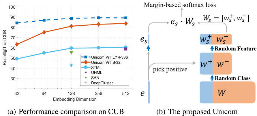 Figure 1: (a) Accuracy in Recall $@1$ versus embedding dimension on the CUB dataset. The proposed Unicom is only trained on the LAION 400M dataset without any manual annotation. (b) The proposed Unicom employs two random selections along the class dimension and the feature dimension to alleviate inter-class conflict and achieve compact representation, respectively.