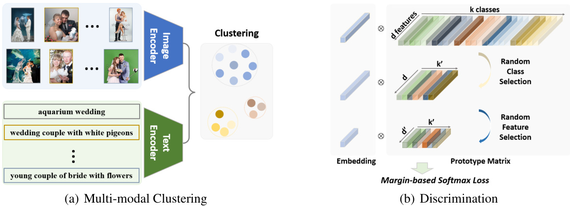 Figure 2: Illustration of the proposed method. (a) The multi-modal clustering includes one off-line step of k-means on features from image and text produced by a pre-trained CLIP model (Radford et al., 2021). (b) Using the assigned clusters as pseudo-labels, we propose a conflict-robust and representation-compact classification method through random class and feature selection along the two dimensions of the prototype matrix.