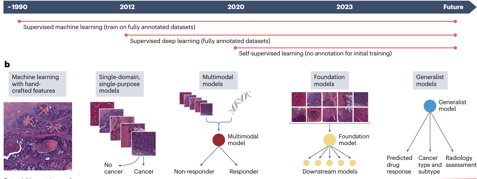 图 2 | 从简单、专用、浅层模型到深度多模态通用模型的计算机视觉发展历程。a, 人工智能 (AI) 技术在医学影像中的进展始于 2000 年代初采用具有手工特征特征的机器学习模型进行监督学习。这些模型依赖领域专业知识从图像中手动提取相关特征,然后利用标记数据集训练模型。约 2012 年,监督深度学习兴起,AI 模型(特别是卷积神经网络 (CNN))通过大型标记数据集训练,直接从原始图像数据中自动学习层次化特征。该方法显著提升了 AI 模型在医学影像任务中的性能与泛化能力。2020 年代初,许多研究团队开始采用新兴的自监督学习方法,使模型能够通过预测数据自身属性(无需依赖外部标签)从未标记数据中学习有意义模式。b, 在 AI 应用于癌症研究的初始阶段,该方法