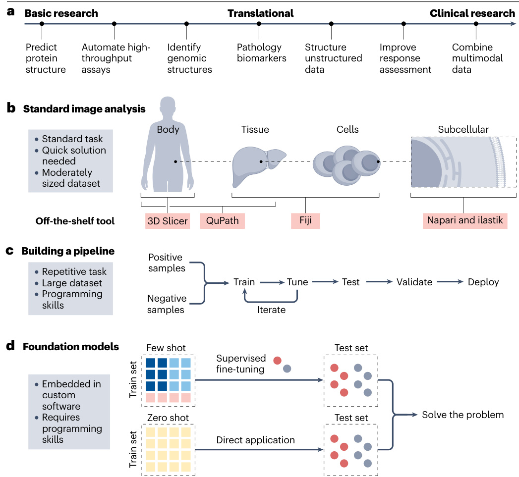 a,Applications of deep learning connect basic, translational and clinical research.In artificial intelligence (Al)-based image processing,three approaches prevail(asshowninb-d).b,Standard image analysis tasks such as cell counting or segmenting regions ofinterest(ROls)often require swift solutions with off-the-shelf tools.Numerous open-source tools are available for accomplishing these tasks.For example,ilastik is well-suited for subcellular analysis,whereas QuPath and 3D Slicer are commonly used for tissue-leveland whole-body imaging,respectively.Fiji,ImageJ and Cell Profiler are versatile tools that can handle a wide range of image analysis tasks across different scales.A selection of these tools is presented in Supplementary Table1.c,Another categoryof image analysis tasks involves those that require an iterative process of training and fine-tuning on extensive datasets.These tools are typically very task-specific and are designed to address one particular question.Constructing,training and validating these pipelines requires programming skills. d, The future of image analysis is trending towards foundation models,which are trained on extensive, heterogeneous datasets and can be finetuned on numerous tasks.Inzero-shot learning,the model is applied directly to the test set without any task-specific training,whereas in few-shot learning, the model is provided with a small number of labelled examples to adapt to the specific task.
