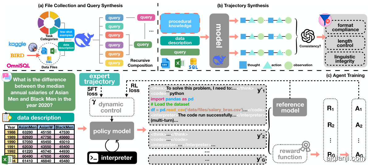 挑战。在这项工作中,我们提出训练一个通用型开源数据分析智能体 (AI Agent) 。这项工作需要解决几个固有挑战:1) 数据资源不足。训练专业智能体需要大规模高质量的任务集合与对应解决轨迹,但公开可用的数据分析基准通常仅提供有限的测试集用于评估目的,且缺乏逐步轨迹标注,使得无法从现有资源中组装有效的训练语料库。2) 训练策略不当。当前智能体训练策略通常遵循SFT后RL的模式,但在新场景中,如何稳定长周期智能体训练以及如何在SFT和RL间分配训练步骤以获得最优性能仍不明确。3) 不稳定的基于代码的多轮展开。数据文件和代码解释器涉及复杂的内存管理,有限内存资源下的并行智能体展开和多轮代码生成将进一步加剧这种情况。