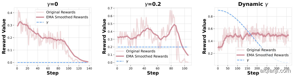 图 4: SFT损失对强化学习训练的影响。$\gamma=0$ 表示未使用SFT损失,$\gamma=0.2$ 对应较低SFT损失权重,动态 $\gamma$ 代表我们的基础设置。