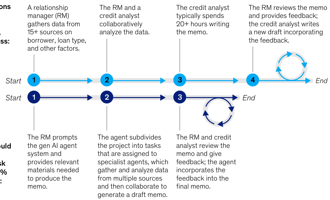 Unlike simpler gen Al architectures, agents can produce high-quality content, reducing review cycle times by 20 to 60 percent. Agents are also able to traverse multiple systems and make sense of data pulled from multiple sources. Finally, agents can show their work: credit analysts can quickly drill into any generated text or numbers, accessing the complete chain of tasks and using data sources to produce the generated insights. This facilitates the rapid verification of outputs.