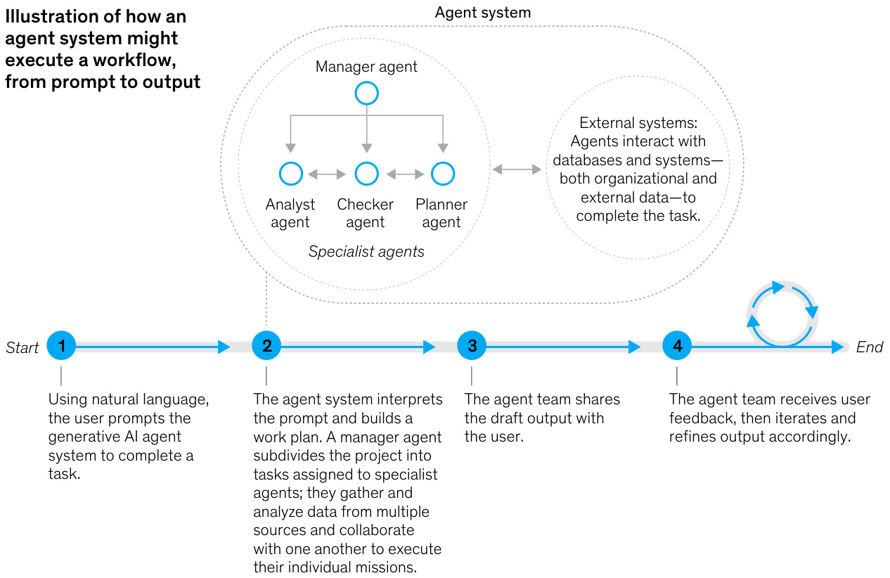 We are beginning an evolution from knowledge-based, gen Al-powered tools—say, chatbots that answer questions and generate content—to gen Al-enabled “agents" that use foundation models to execute complex, multistep workflows across a digital world. In short, the technology is moving from thought to action.
