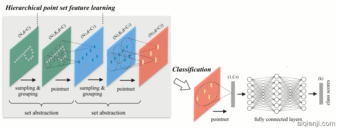 我们可以重复set abstraction的过程,实现一个多级的网络,下图展示两级, 使得点的数量越来越少,但是每个点代表的区域以及感受野,越来越大,这个cnn的概念很类似,,最后把点做一个pooling 得到globle feature,用来做分类。