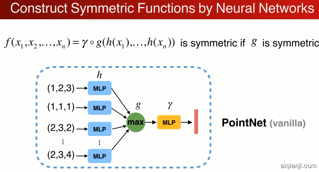 与其说直接做对称性可以先把每个点映射到高维空间,在高维空间中做对称性的操作,高维空间可以是一个冗余的,在max操作中通过冗余可以避免信息的丢失,可以保留足够的点云信息,再通过一个网络r来进一步 消化信息得到点云的特征。这就是函数hgγ的组合。每个点都做h低位到高位的映射,G是对称的那么整个结构就都是对称的。下图就是原始的pointnet结构。