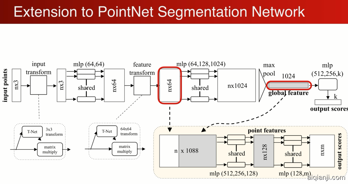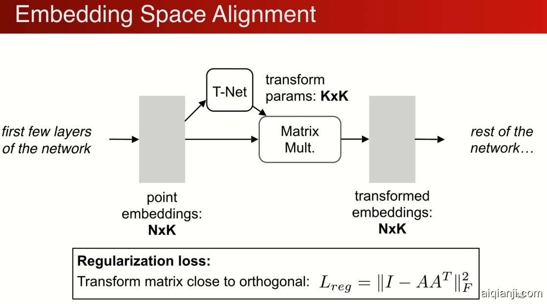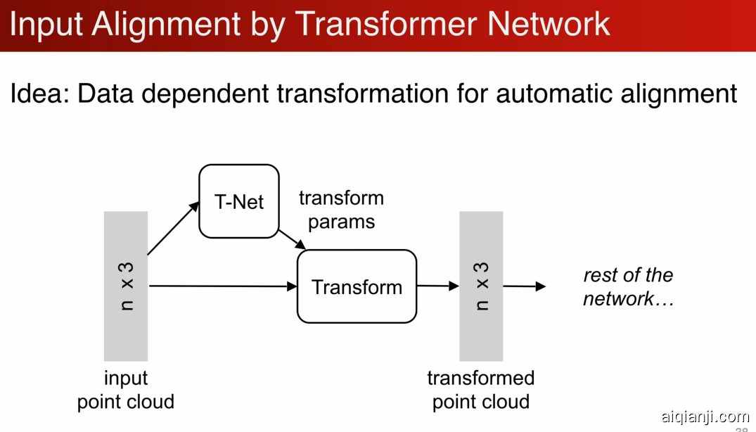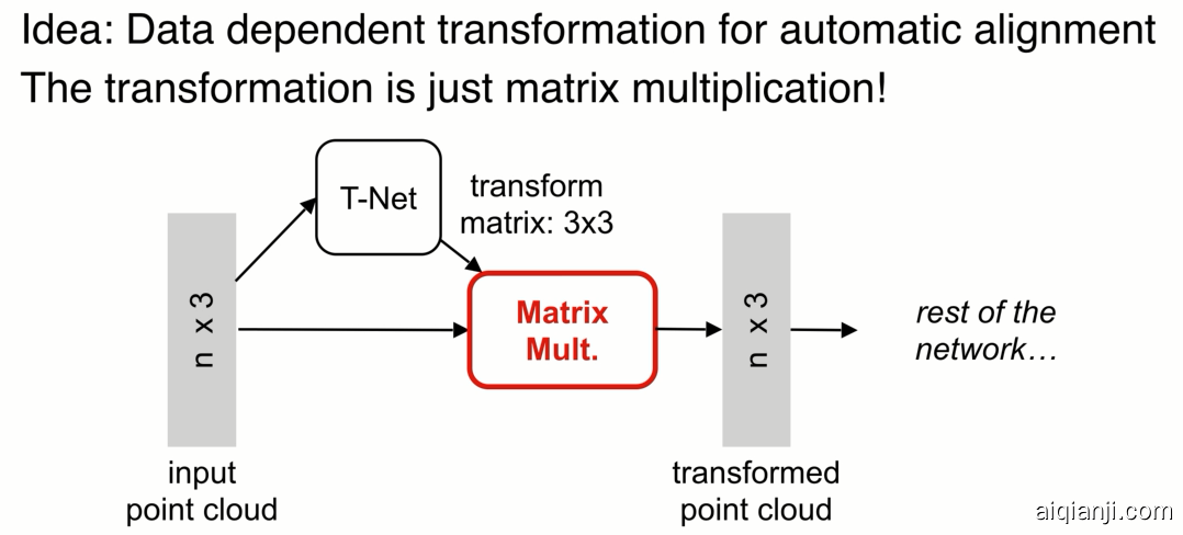 增加了一个基于数据本身的变换函数模块,n个点(x,y,z) t-net 生成变换参数,之后的网络处理变换之后的点,目标是通过整体优化变换网络和后面的网络使得变换函数对齐输入,如果对齐了,不同视角的问题就可以简化。