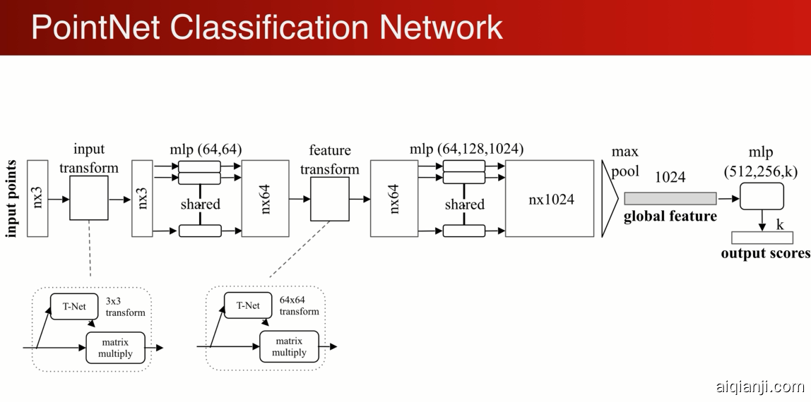 首先输入一个n3的矩阵,先做一个输入的矩阵变换,T-net 变成一个33的矩阵,然后通过mlp把每个点投射到64高维空间,在做一个高维空间的变换,形成一个更加归一化的64维矩阵,继续做MLP将64维映射到1024维,在1024中可以做对称性的操作,就是maxpooling,得到globle fearue,1024维度 ,通过级联的全连接网络生成k (分类)