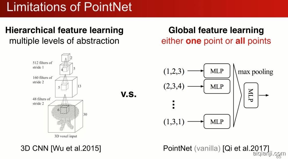 本质上来说,要么对一个点做操作,要么对所有点做操作,实际上没有局部的概念(loal context) ,比较难对精细的特征做学习,在分割上有局限性