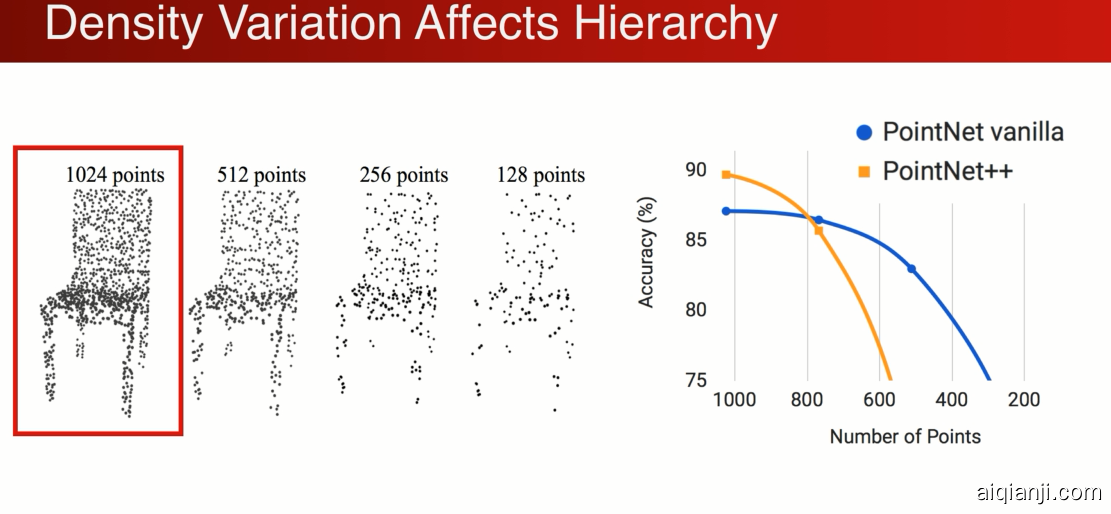 在刚开始1024点的时候point net ++ 更加强大,得到更高的精确度,应为它是在小区域上,随着密度的下降,性能收到了极大的影响,在小于500个点以后性能低于pointnet