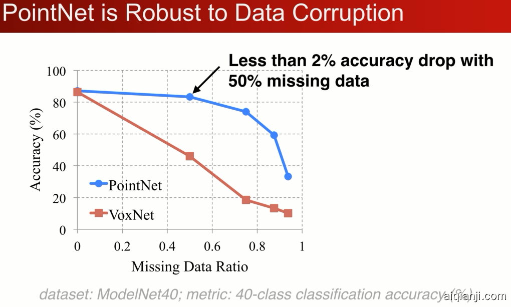 在modelnet 40 的分类问题上,在丢失50%的点的情况下,pointnet仅仅收到2%的影响,与之想想比Voxnet3D精度相差了20%