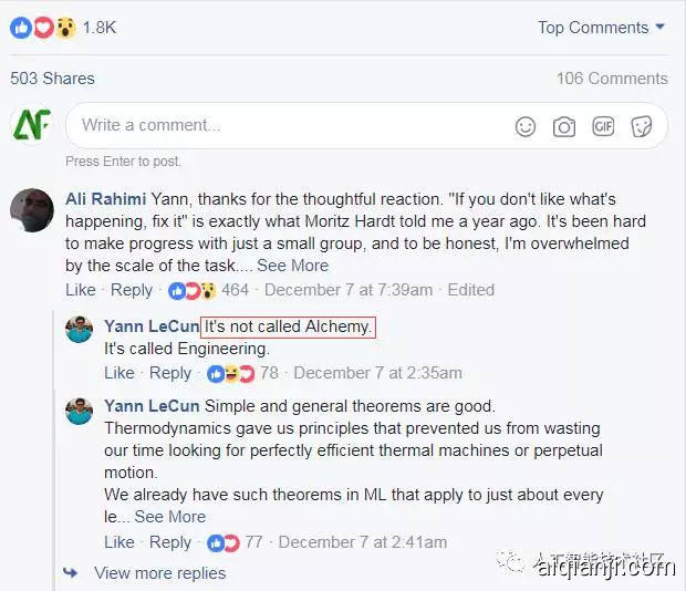 而Lecun则回怼说:仅仅因为理论没有追赶上实践的水平,就批评整个机器学习社区使用「炼金术」,这种言论是危险的。