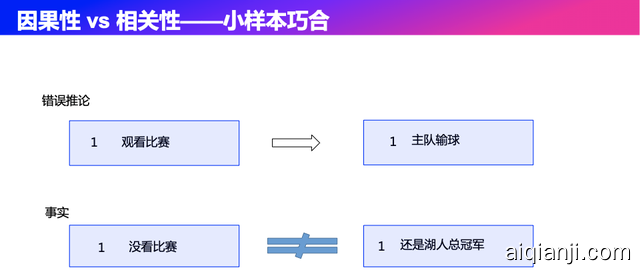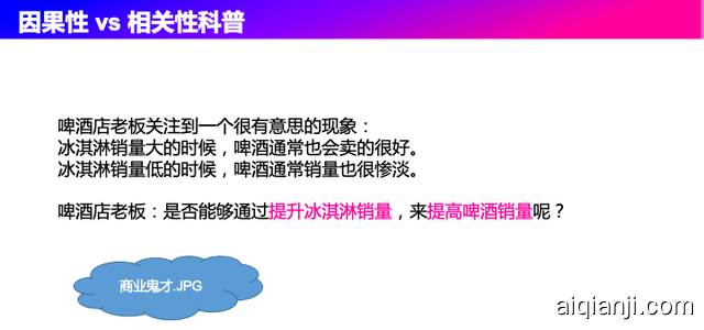 这是误用相关性的第三类错误。老板认为:冰淇淋销量是啤酒销量的因,通过促销冰淇淋来带动高利润的酒水。实际上的因果关系:因为夏天来了,天气变热了,冰淇淋的销量会大幅提升。同样,天气变热,喝酒撸串的人也变多了,所以啤酒也会销量提升。冬天来临时,老板低价冰淇淋卖破产了,啤酒销量也不见得能提升多少。这就是第三类错误:共同场外因素作用。