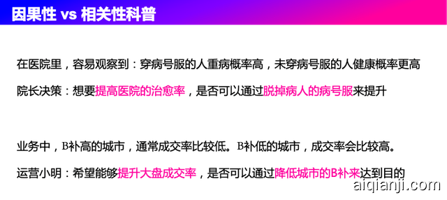 这就是误用相关性的第一种CASE——因果颠倒。医院的例子中:院长认为:穿病号服会导致用户患重病,脱病号服会让用户治愈业务中的例子:小明同学认为,投入B补会降低城市成交率,降低B补会提高城市成交率。