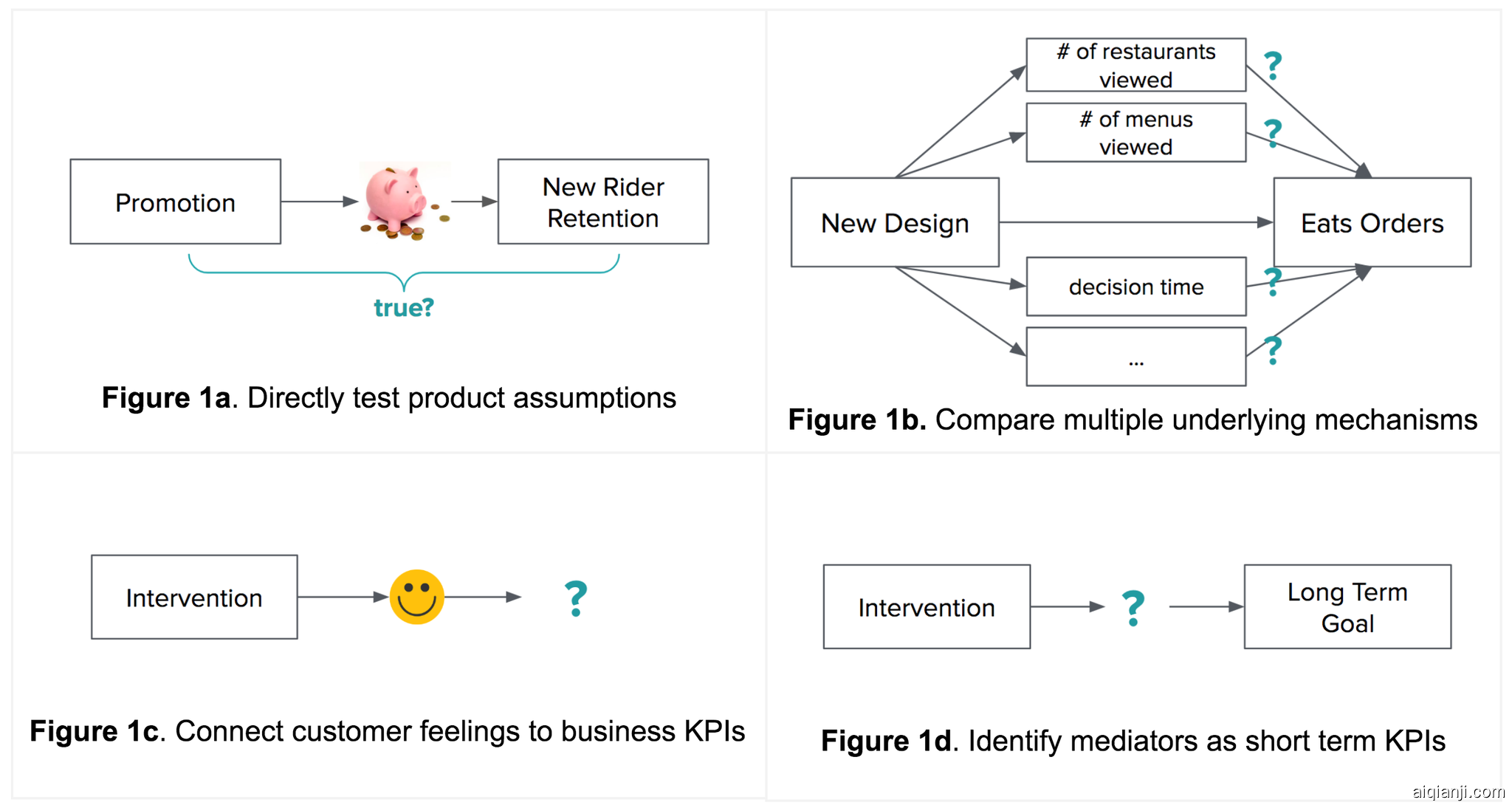 此外,中介建模可以是将长期目标分解为更小的中间步骤的一种创造性方法。 例如,假设我们的目标是提高长期乘客对 Uber 的满意度。 我们如何将这个目标分解成更小的部分,并与我们的日常工作联系起来? 如果我们之前已经确定了骑手满意度背后的关键中介,那么我们就可以利用这个中介作为短期关键绩效指标(KPI)(图1 d)。 如果干预的大部分效果是通过某一特定机制引起的,那么影响该关键调解人可能是干预发挥作用的一个必要(虽然不是充分)条件。