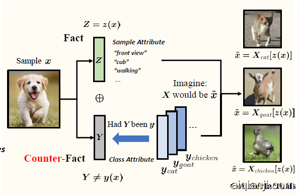 反事实生成和现有生成模型的最大区别就是基于了特定的样本特征(fact)来进行生成,而非高斯噪声。具体过程如上图所示,对于一个图片,我们通过 encoder 拿到这个图片的样本特征(比如 front-view,walking 等),基于这个样本特征(fact)和不同的类别特征(counterfact),我们可以生成不同类别的反事实图片(front-view,walking 的猫,羊和鸡等等)。直觉上,我们知道,因为反事实生成的猫、羊和鸡的图片很不像,肯定不属于这三个类别。这种直觉其实是有理论支持的 — 叫做 *反事实一致性(Counterfactual Consistency Rule)