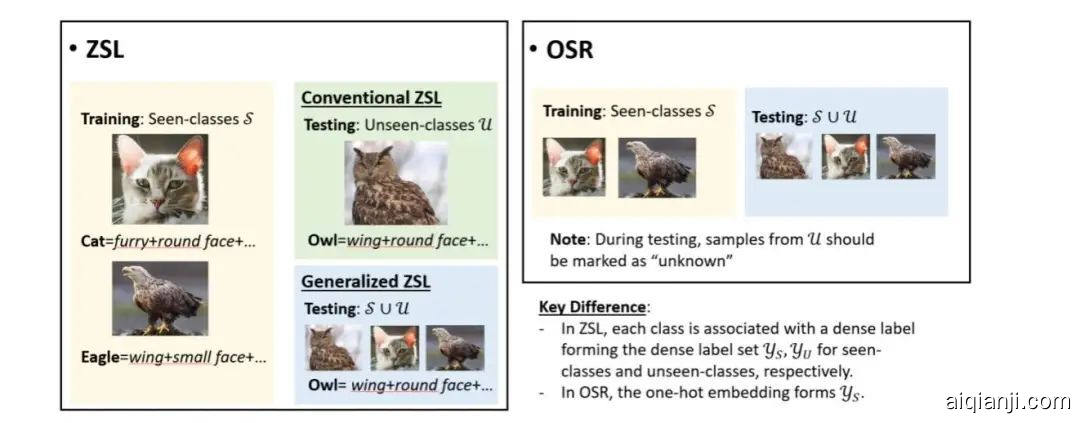 在机器学习当中,这两个任务的定义如上图所示。零次学习训练集提供类别集合。上面的图片,除了每张图片的类别标签,每个类别还额外有一个属性特征 (attribute) 来描述这个类的特点(比如有翅膀,圆脸等等),测试的时候有两种设定:在 Conventional ZSL 下全部是未见类别中的图片(),并且测试的时候也会给定类别的 dense label,而在 Generalized ZSL 中测试集会有和中的图片。开集识别的训练集则和普通的监督学习没有差别,只是在测试的时候会有训练未见过类别的样本,分类器除了正确识别见过的类,还要将未见过的类标成“未知”。