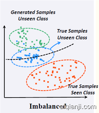 现有的 ZSL 和 OSR 的主要方法是基于生成的,比如 ZSL 中用未见类别的属性特征生成图片,然后在 image space 进行比较。然而生成模型会自然的偏向见过的训练集,使得对于未见类别的想象失真了(这其实是因为属性特征的 entanglement,这里我不详细展开,大家可以参考一下论文)。比如训练的时候见过大象的长鼻子,而去想象没见过的貘的长鼻子的时候,就会想象成大象的鼻子。左边的图展现了这种失真:红色是训练集里面的样本,蓝色是 ground-truth 的未见过类别的样本,绿色是现有方法对未见过类别的想象,这些想象已经脱离了样本空间,既不像见过的类,也不像没见过的类(绿色的点偏离了蓝色和红色的点)。这就解释了为什么见过和未见过类别的识别率会失衡了:用绿色和红色样本学习的分类器(黑色虚线)牺牲了未见过类的 recall 来提高见过类的 recall。