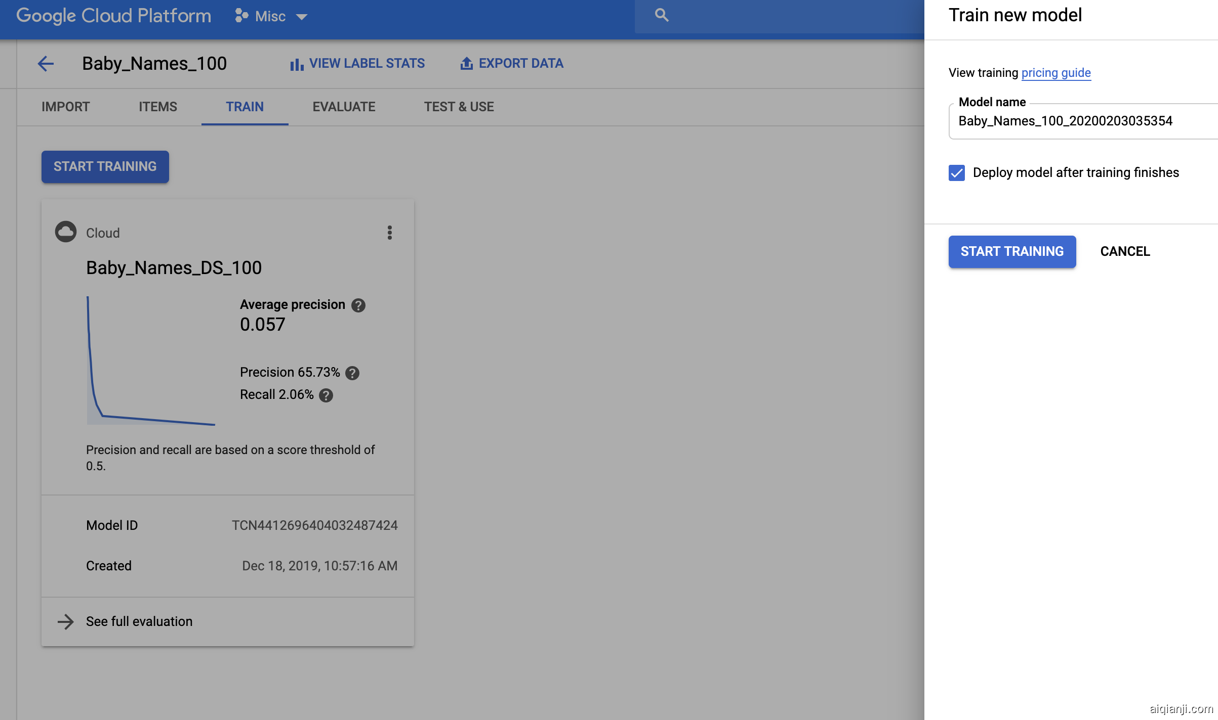 Even though I attempted to remove first and last names, a couple of middle names names slipped in!To train a model, I navigated to the “Train” tab and clicked “Start Training.” Around four hours later, training was done.
