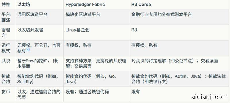 表 1: 以太坊、Hyperledger Fabric 和 Corda 的对比