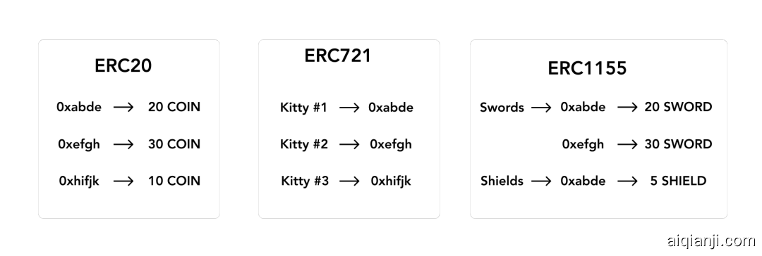 这种系统的一个优点是效率: 基于ERC721,如果用户想要转移1000把剑,需要修改智能合同的状态(通过调用 transferFrom 方法) ,以获得1000个唯一的通证。而使用 ERC1155的话,只需要调用 transferFrom 方法,和数量为 1,000的参数并执行一次操作。当然,这种效率的提高伴随着信息的丢失: 人们再也无法追踪单把剑的历史。